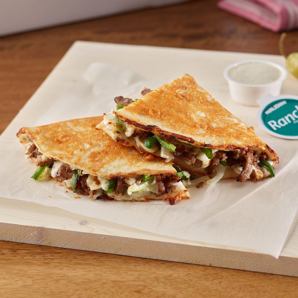 Flatbread-style sandwich with Philly sauce, cheese, steak, onions and green peppers. Served with garlic dipping sauce.